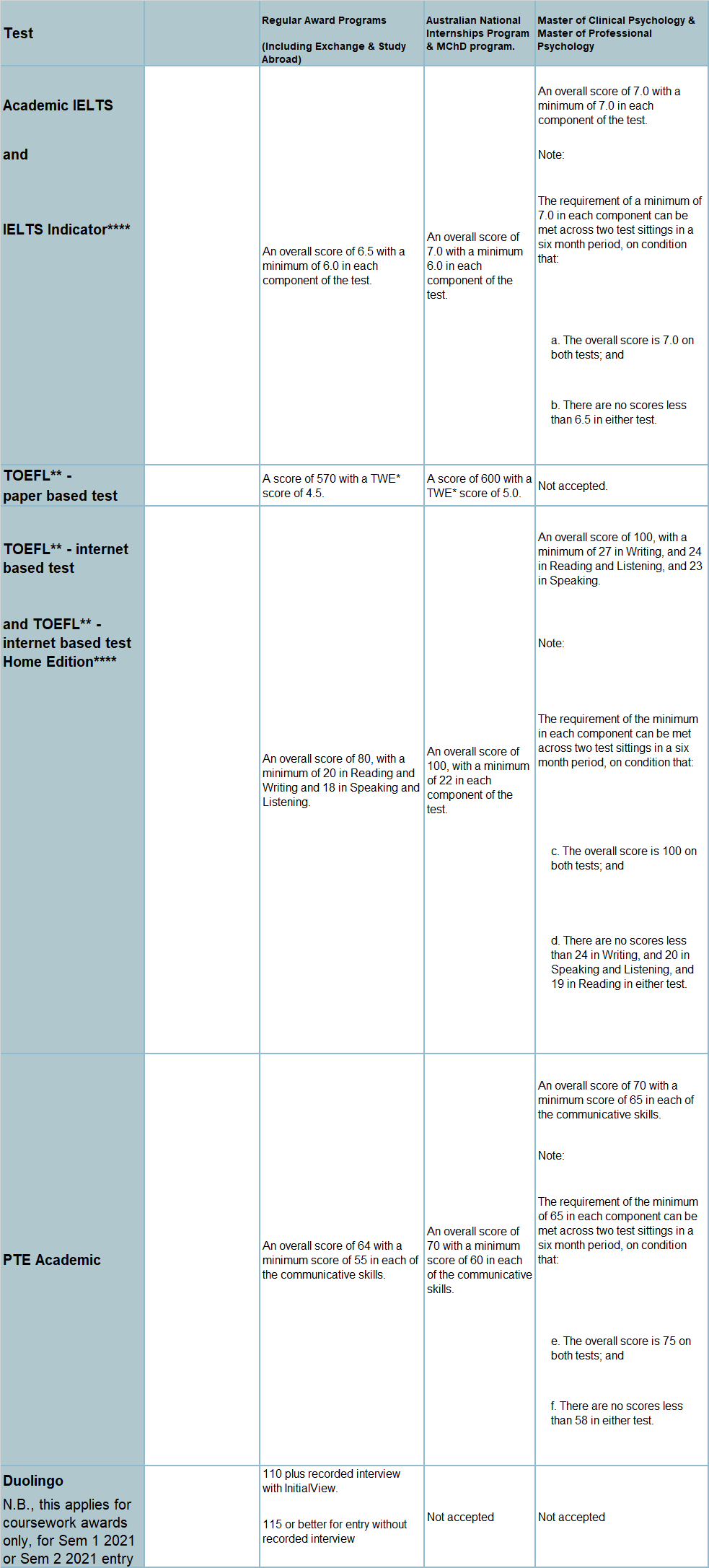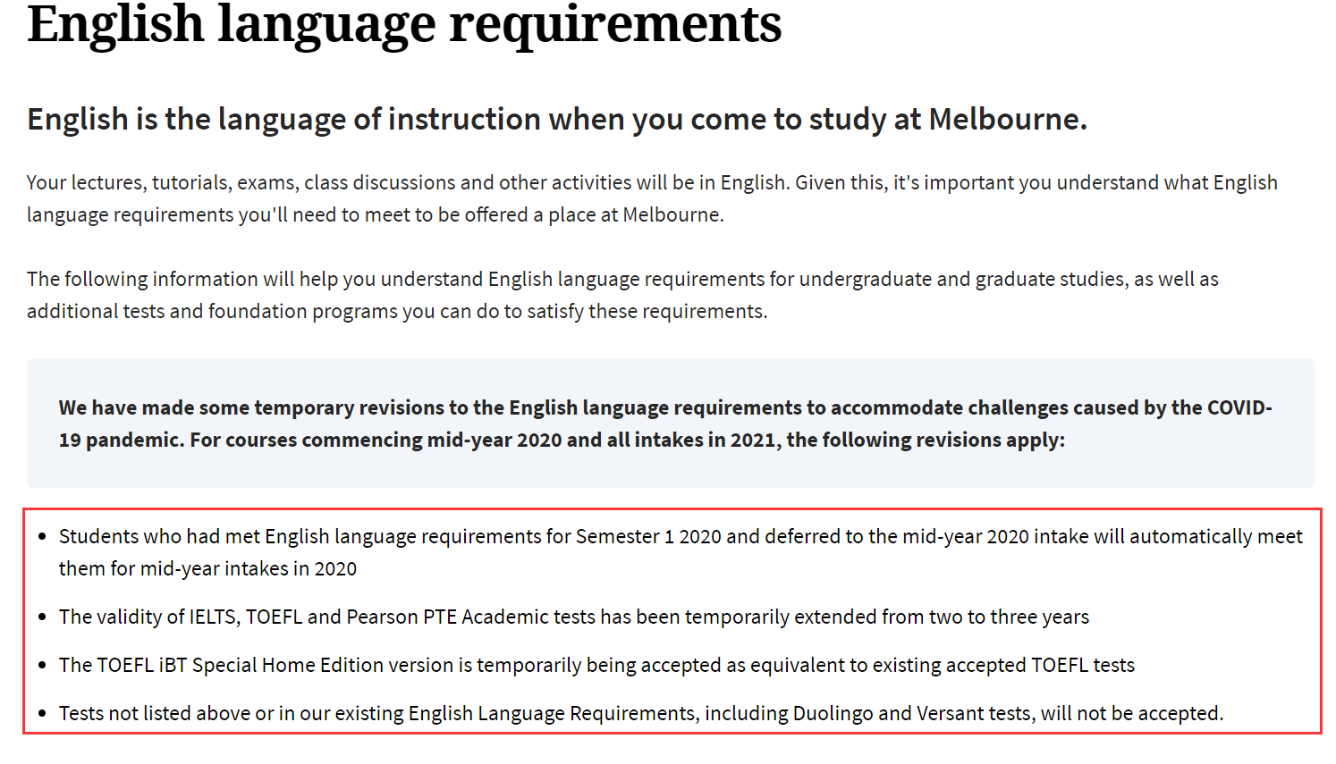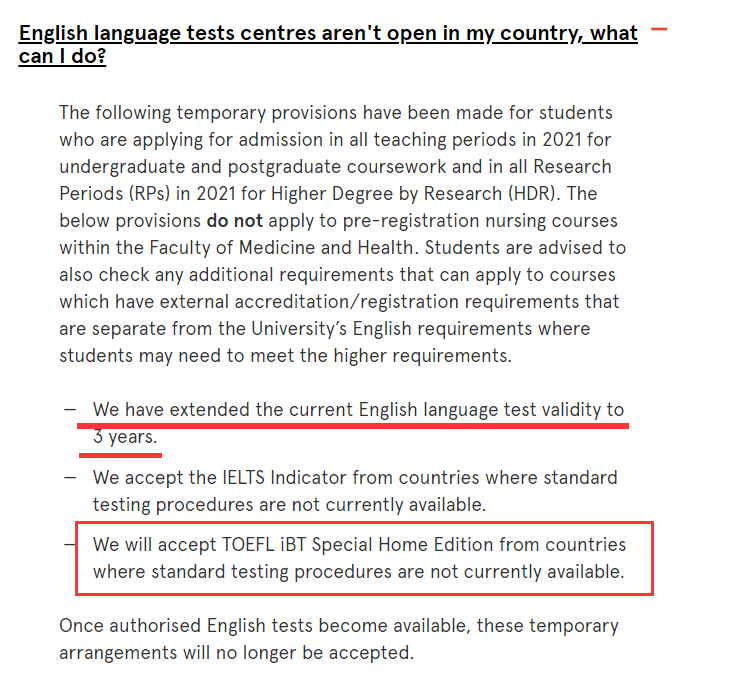 2021年Term 1的本科及碩士課程(也就是2月份開課),認可TOEFL home edition、IELTS indicator、DUOLINGO*(備注:必須是1月31日前考的Duolingo成績)