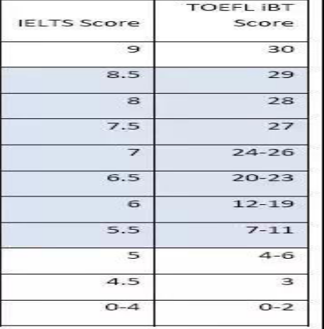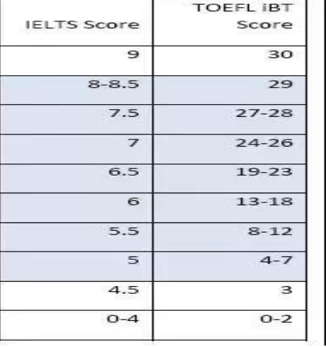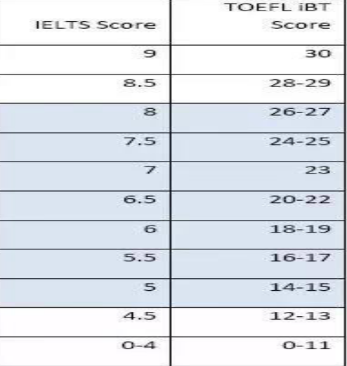 那么托福和雅思考試哪個難?哪個考試容易獲得高分呢?這里小編摘取了ETS發(fā)布的研究報告《LinkingTOEFLiBTScorestoIETSScores:AResearchPaper》里TOEFL與IELTS在總分與單項上的分數(shù)對應關系。考生們可以根據(jù)表格換算得出托福和雅思哪個難。