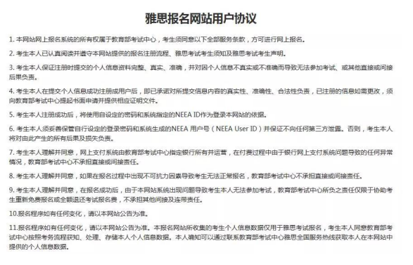 如果您從未使用過教育部考試中心雅思報名網(wǎng)站,您必須先注冊成為網(wǎng)站用戶。在注冊之前,您將看到網(wǎng)上報名協(xié)議,您必須點擊“同意”按鈕接受并遵守這些條款,否則,系統(tǒng)將不允許您進(jìn)行注冊。在提供個人基本信息、證件信息、聯(lián)系信息并設(shè)置密碼后,您將得到教育部考試中心報名系統(tǒng)分配給您的一個 NEEA用戶號(NEEA user ID) 。