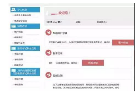 付費須知:您可以使用支付寶或首信易支付來支付考試費、轉(zhuǎn)考費及考后服務(wù)費。如果您取消報名,您所支付的考試費在扣除退考費后將自動退回到您的NEEA賬戶中。
