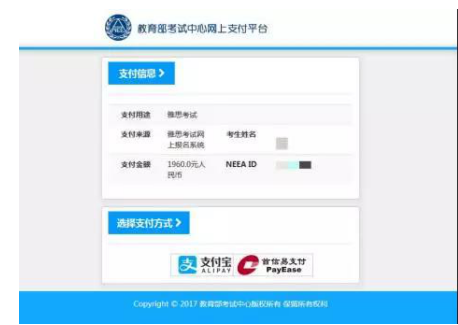 網(wǎng)上付費:請點擊支付寶或首信易支付按鈕,您將被引導(dǎo)到相應(yīng)支付平臺進(jìn)行網(wǎng)上支付。當(dāng)付費完成后,請記錄下報名網(wǎng)站系統(tǒng)所提供交易訂單號,以便日后用于核對和查詢您的付款。通常教育部考試中心雅思報名網(wǎng)站會立即收到您的付款確認(rèn)。在極少數(shù)情況下,系統(tǒng)會延遲確認(rèn)考生的付款。因此,請在支付成功24小時之后,登錄教育部考試中心雅思報名網(wǎng)站,核實您的付費和報名狀態(tài)。