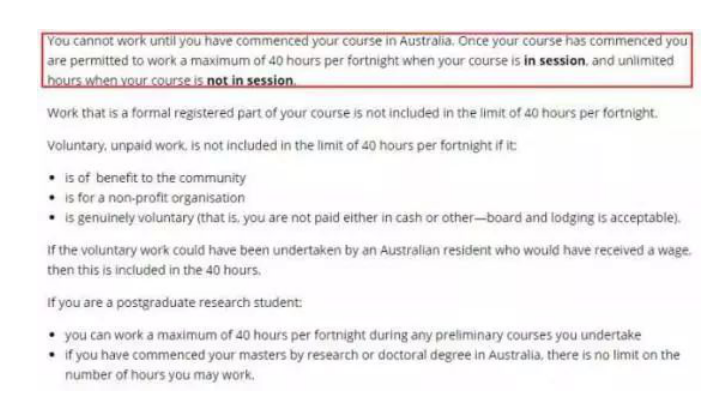 自2008年起,澳大利亞的學生簽證都自帶打工許可,學校規定每周的打工時間不超過20個小時,假期可放寬工作時間,如果是學校課程規定的實習時間就不會算在20個小時之內。學生打工之前需要相當低稅局申請稅號。