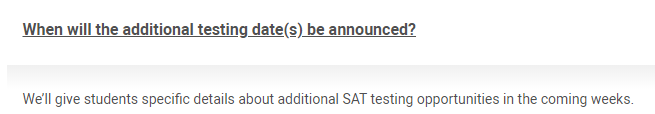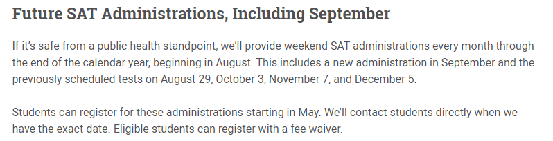 各位寶寶表傷心,CB也帶來了好消息。從2020年8月起到2020年年底,CB將會每月開設一次SAT考試。學生從5月起可以報考相關SAT考試。