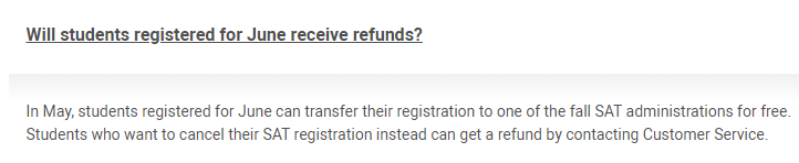 當然,已注冊6月考試的寶寶們,可以取消考試,CB會給退錢,還可以轉考其它月份的SAT考試。