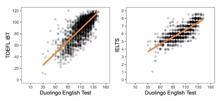 基于2319位同時參加了多鄰國英語測試和托福網考的考生,以及991位同時參加了多鄰國英語測試和雅思考試的考生的成績。在分數對比中,這些相關系數呈現強正相關的統計關系。