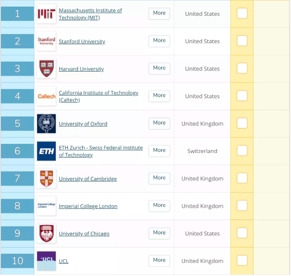 和去年一樣,今年的QS世界大學排行榜的前四名依然被美國大學包攬!斯坦福大學、哈佛大學、加州理工大學分列二到四名。多數美國大學的排名都有所上升。盡管目前,美國國內情況不盡如人意,但依舊不能撼動美國大學在世界大學的頭部角色。美國依舊是多數渴求“前沿技術、思維”留學生的不二選擇。