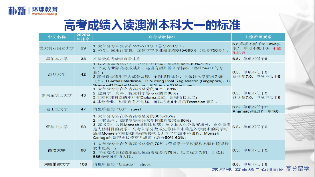 澳大利亞的八大一直是申請澳洲學生的首選,那么該如何使用高考成績來申請澳洲本科呢?劉老師在講座中詳細解讀了不同院校錄取標準中的高考及雅思成績要求,并給出申請建議。對于成績未達到澳洲本科大一標準的同學可以選擇澳洲八大的過渡課程。