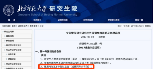 以北京師范大學為例,研究生院雅思考試達到6.5分以上即可免修英語: