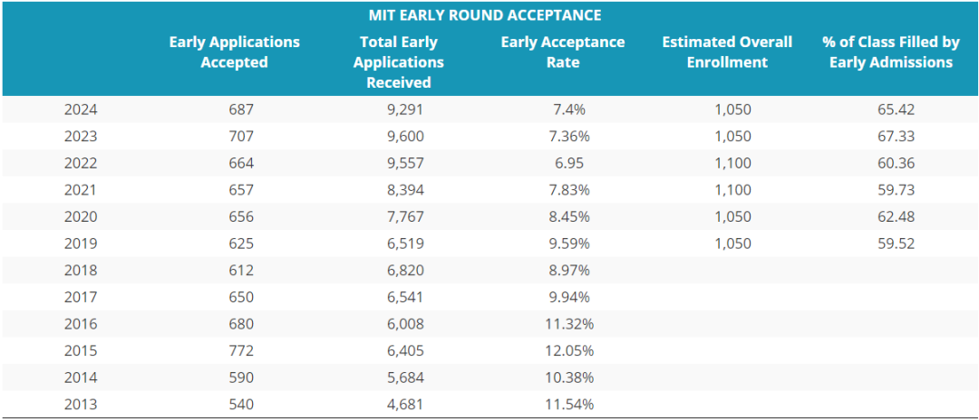 要說MIT有多嚴格,從早申錄取率就能看出來,別的學校都是常規錄取5%以下,早申都在10%以上。然而MIT的早申和常規申請錄取率都差不多,從2017屆開始,連續8年,兩種錄取率均低于10%。