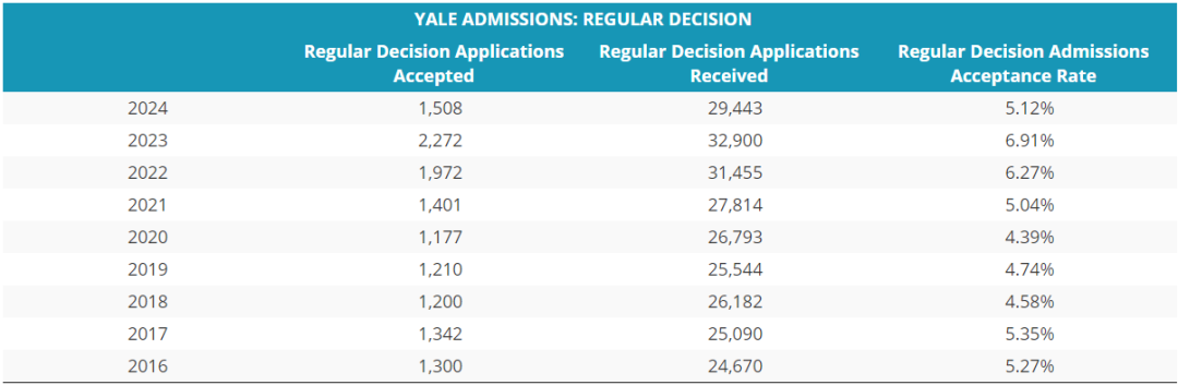 耶魯的常規錄取方面,變動比較復雜,前幾年都已經跌倒了5%以下,近幾年又差點沖上7%,而今年又掉到了5.12%,著實難搞。