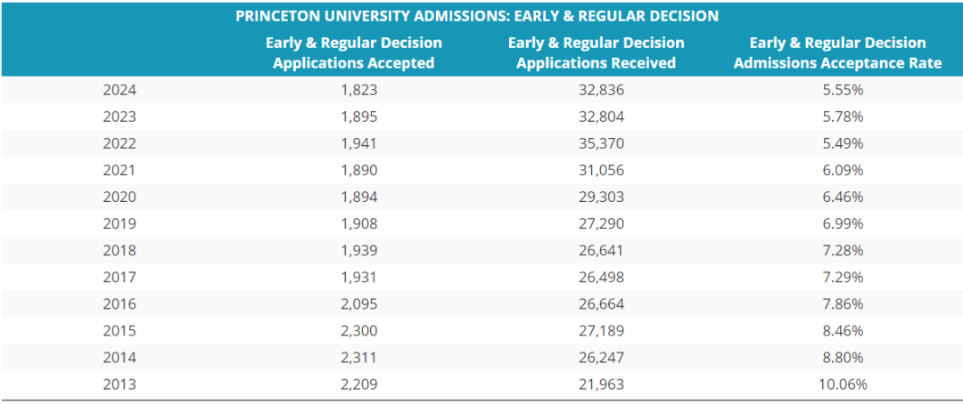 與所有頂級學校的趨勢相似,普林斯頓大學的錄取率在過去幾年中持續下滑,連續11年錄取率低于10%。