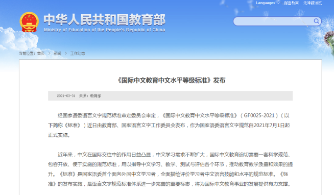根據教育部網站消息,經國家語委語言文字規范標準審定委員會審定,《國際中文教育中文水平等級標準》(GF0025-2021)(以下簡稱《標準》)近日由教育部、國家語言文字工作委員會發布,作為國家語委語言文字規范自2021年7月1日起正式實施。