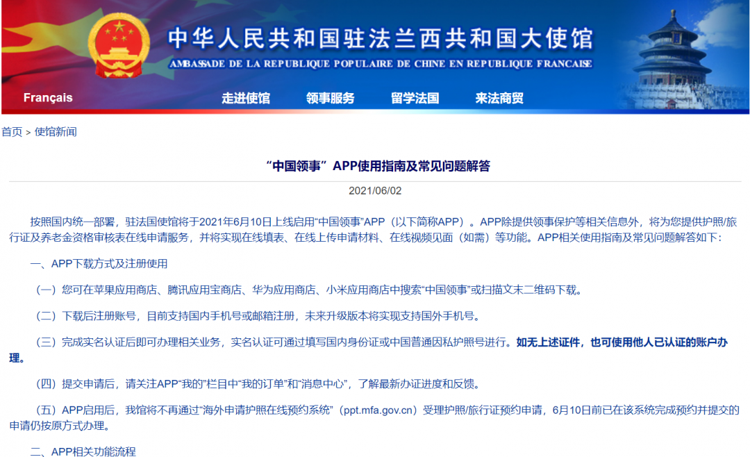 2021年6月2日,使館發布《“中國領事”APP使用指南及常見問題解答》,就“中國領事”APP的下載流程、使用流程以及目前民眾使用APP后出現的常見問題作出解答。詳情登陸中國駐法國大使館官網。