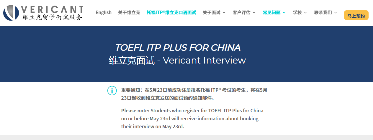 考生成功注冊報名托福ITP®考試后的1-2天內會收到維立克發送的面試預約通知郵件(從5月23日起),郵件中有維立克口語面試的賬戶和密碼,請點擊鏈接 https://registration.vericant.cn/#/toefl-itp 用維立克提供的賬戶和密碼預約您的維立克口語面試。
