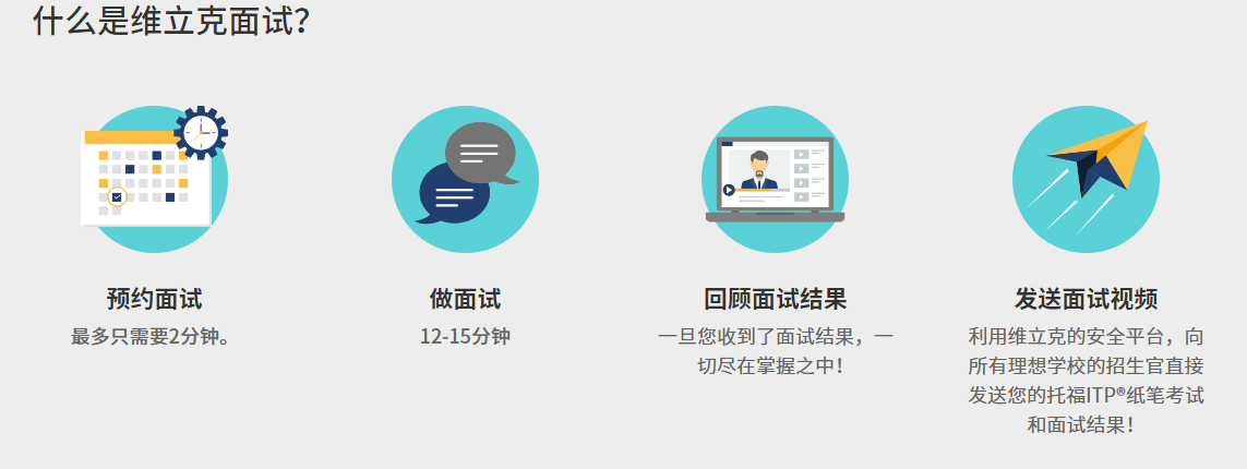 •對于申請大學及以上高等教育的申請者,維立克口語面試是結構化的行為面試。在真實,安全的環境下與母語為英語的面試官進行一對一互動,時長約12-15分鐘。